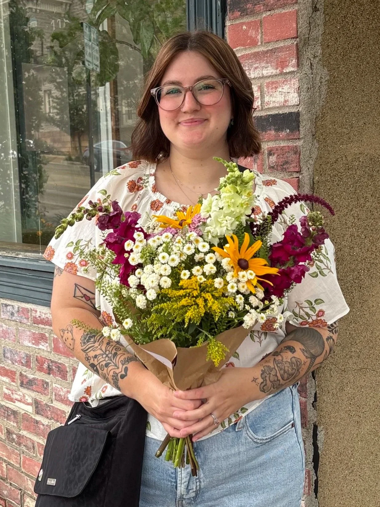 Abby Pennington is a contemporary painter born and raised in Ohio. She was introduced to art at an early age by her mom, a mosaic artist and painter, who inspired her to explore various art mediums. Some of her best childhood memories are sitting on the floor of the kitchen (where the best lighting was) and watching her mom bring a canvas to life. Abby experimented with magazine-clipping collage, clay sculpture, painting/drawing, and helping out with mosaic projects. This led her to pursue art classes in high school and later a Fine Arts degree from Ohio University. It was here that she took her first painting class and fell in love with oil painting. Throughout her time at OU, she developed a unique style of bold and colorful art. Since receiving her BFA, Abby has continued developing this style and finding new ways to incorporate her love of color in her work.